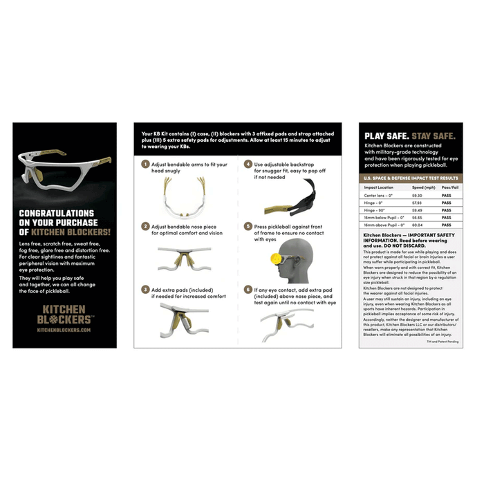 Your eyes need to be protected. Studies have shown that 47% of Pickleball players get hit in the eye or face areas. With Kitchen Blockers™ you can provide full protection for your eyes while maintaining the highest level of game! Lens free means zero light refraction, zero fog, scratch free, sweat free and gives you full court vision! Make your face a safe space, a product for Pickleball, designed by Pickleball players!